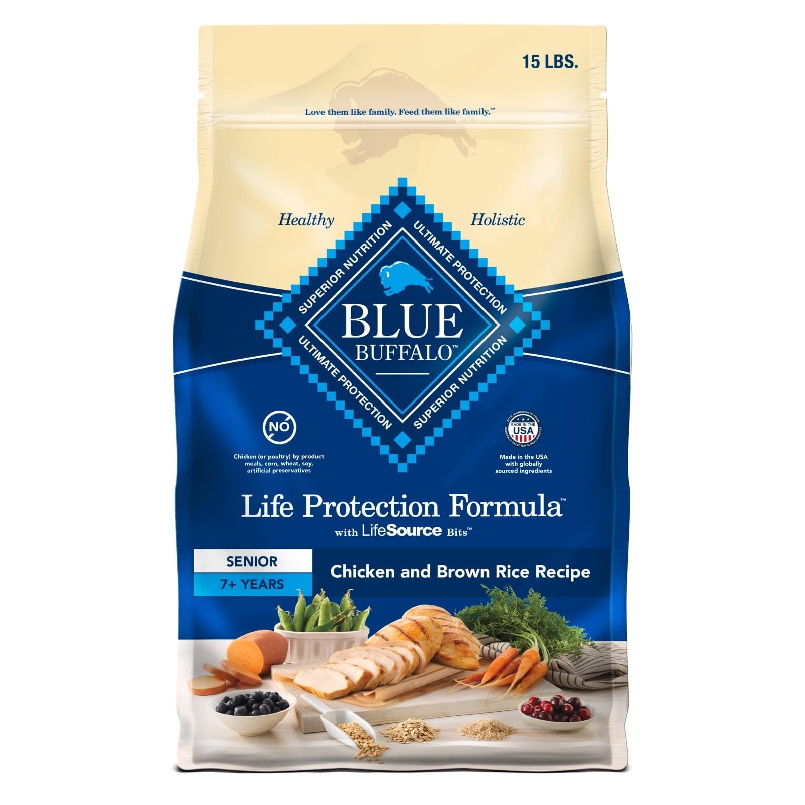 • Contains: One (1) 15-lb. bag of BLUE Life Protection Formula Natural Senior Dry Dog Food Chicken and Brown Rice Flavor