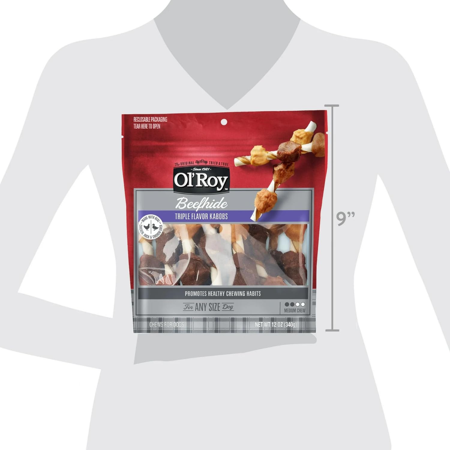 Triple Flavor Kabobs Rawhide Chews Dry for All Dogs, Made with Real Chicken, Duck & Chicken Liver Beefhide, Triple Flavor kabobs, 12 oz
